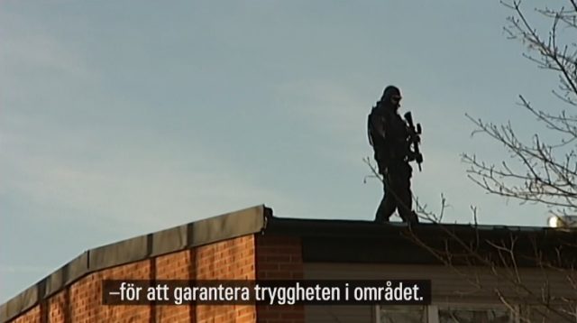 Enligt SVT begärde åklagaren att tingsrätten skulle besöka brottsplatsen och på eftermiddagen tog man sig ut till området. För att möjliggöra besöket och för att Polisen skulle kunna garantera säkerheten var man tvungna att kalla in insatsstyrkan. På nedanstående bild syns en polis med förstärkningsvapen övervaka området från ett hustak.