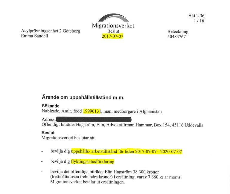 Samhällsnytt har kontrollerat denna uppgift som visar sig stämma: Nabizadeh fick sitt asylbeslut i juli 2017, alltså efter att han hade fyllt 18 enligt den åldersuppgift som han är registrerad under i Sverige. Beslutet gav Nabizadeh flyktingsstatus och ett uppehållstillstånd i tre år enligt den tillfälliga lagen: