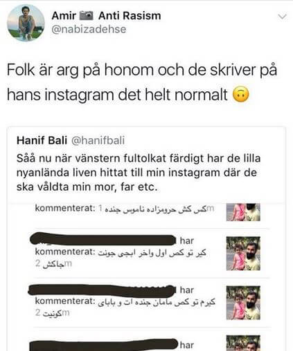 En tid innan riksdagsledamoten skrev inlägget med anklagelser om åldersfusk hamnade han i konfrontation med Nabizadeh på Twitter. Talespersonen för ”flyktingbarnen” skrev då att det var ”helt normalt” att vissa personer tillhörande gruppen uttalade våldtäktshot riktade mot Hanif Balis familj. Twitter-inlägget avslutades med en glad emoji:
