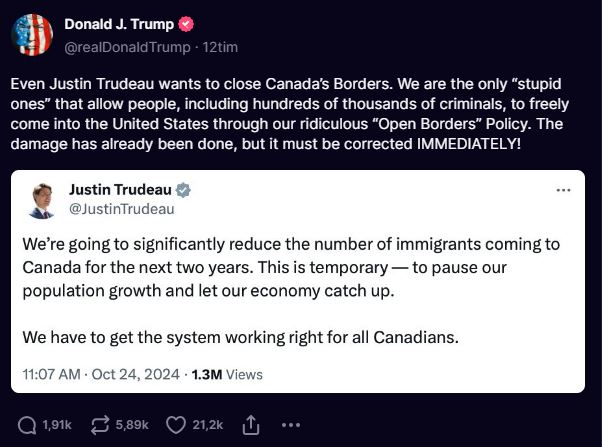 I grannlandet USA kommenterar Donald Trump beslutet och konstaterar att till och med Kanada och Trudeau vill minska invandringen: