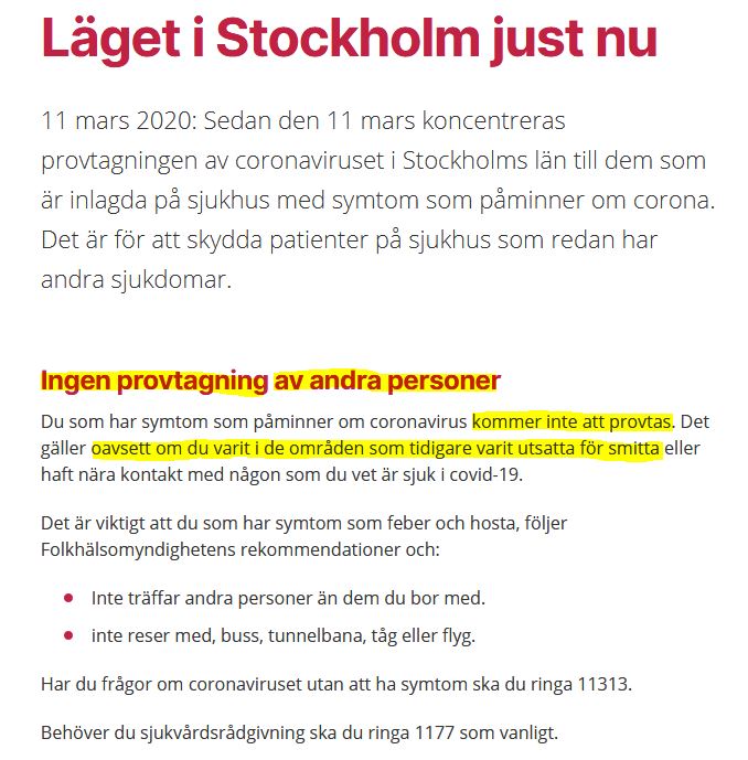 I ett meddelande informerar vårdtjänsten 1177 att fr o m idag stoppas provtagning av alla misstänkta coronafall förutom de som är inlagda på sjukhus. Inte ens personer som varit i de drabbade områdena kommer att testas för corona :