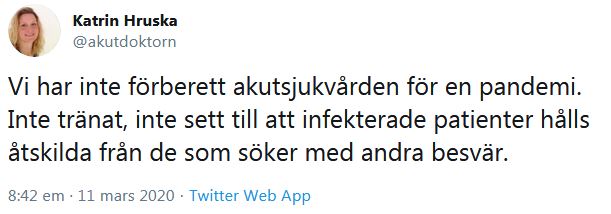 Svenonius har inte förklarat hur den administrativa personalen ska kunna ge vård till svårt sjuka eller bemanna den komplicerade medicinska utrustningen. Under tiden har fyra av regionens sjukhus gått upp i stabsläge på grund av epidemin. Samtidigt framkommer alltfler uppgifter om att situationen på akutsjukhusen är kritisk redan nu. En akutläkare nedan vittnar om en brist på skyddsutrustning, prov för coronavirus och annat: