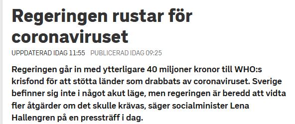 I Sverige däremot rapporterar statstelevisionen att svenska regeringen ”rustar för coronaviruset” – genom att skänka ett bidrag på 40 miljoner till WHO: