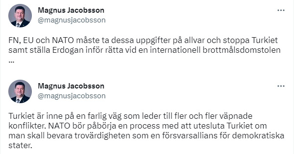 Jacobsson har även krävt att Nato sparkar ut Turkiet ur militäralliansen, samt begärt att landets president Recep Erdogan ställs inför rätta vid internationella brottmålsdomstolen.