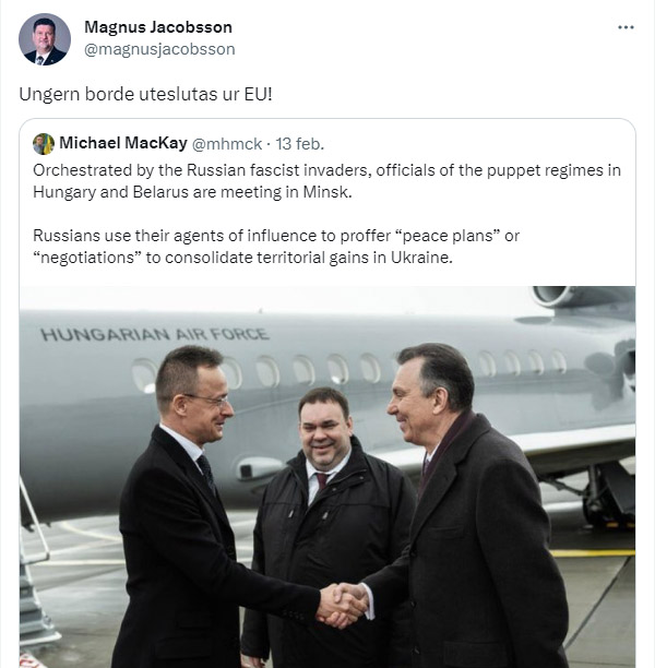 Och attackerad har den ungerske utrikesministern blivit. Bland annat av Kristdemokraterna i Sverige, där riksdagspolitikern Magnus Jacobsson retweetar ett inlägg om att ungerns regering är en rysk ”marionettregim”.