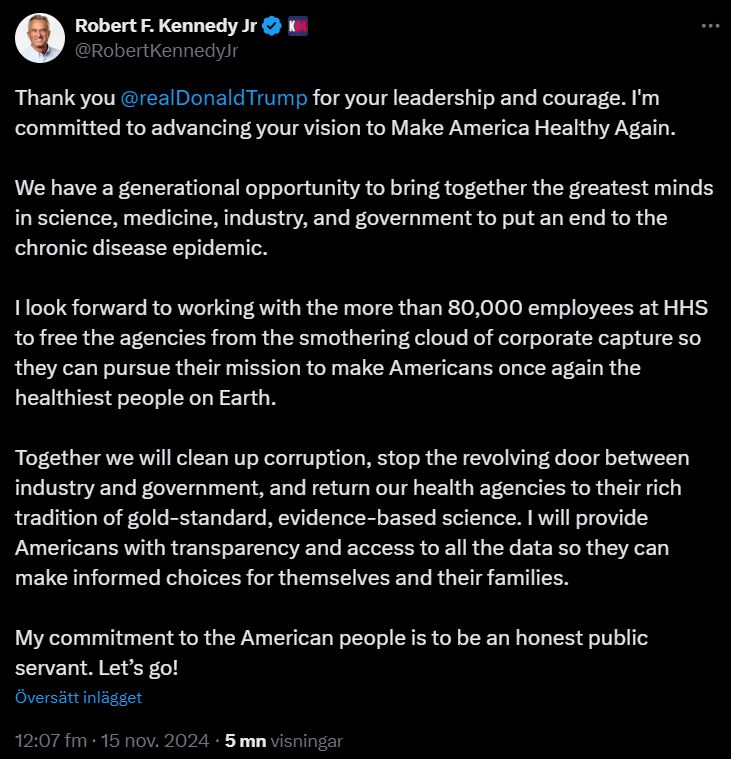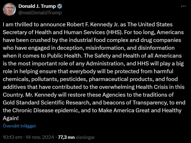 Under de senaste dagarna har Donald Trump presenterat vilka personer som kommer att ingå i hans nya administration som tillträder i januari. En av flera tidigare demokrater som gett sitt stöd till Trump är Robert F Kennedy Jr som haft mat och hälsa som sitt specialämne och som väntat får han rollen som hälsominister.