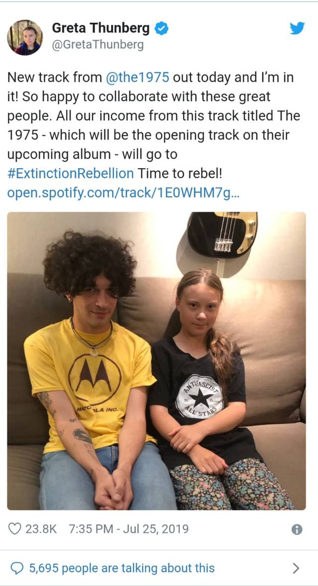 Klimat-Greta ska finansiera vänsterextrem organisation Som framgår av tweeten går intäkterna från låten till klimataktivisterna i Extinction Rebellion, en vänsterextrem organisation som Samhällsnytt rapporterat om flera gånger tidigare.