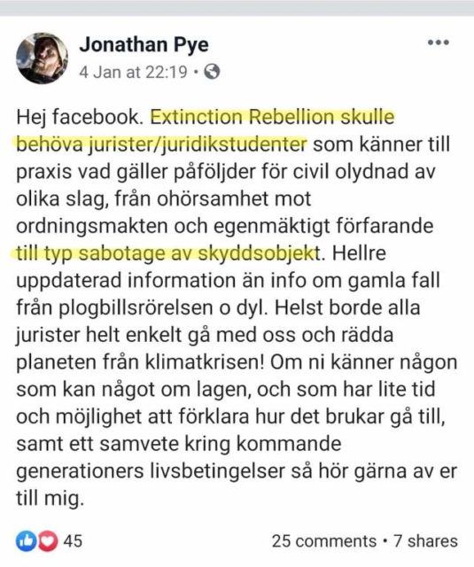Planerar fler brott I januari i år ber han på Facebook öppet om juridisk hjälp för Extinction Rebellions räkning med syfte att begå brott, bland annat sabotage mot skyddsobjekt: