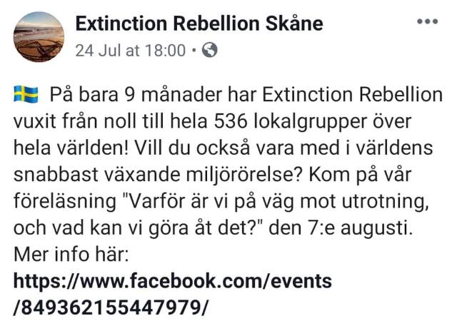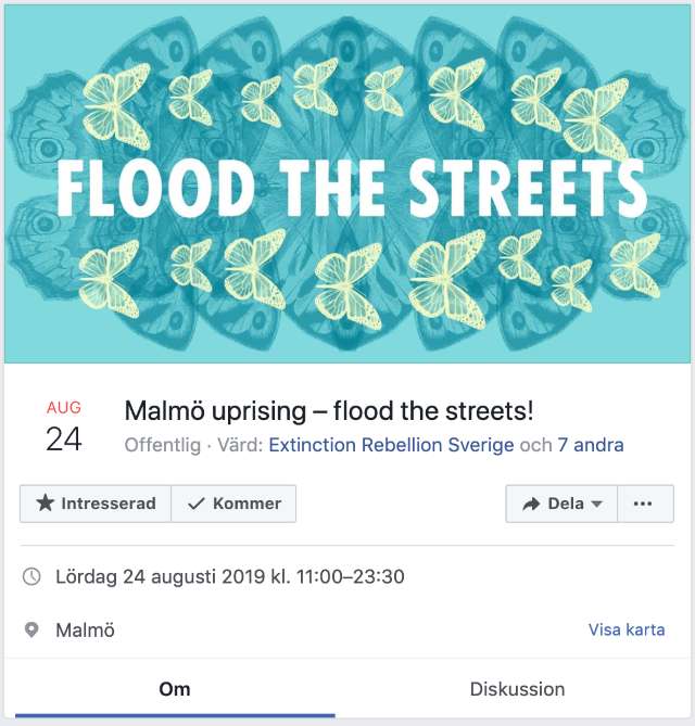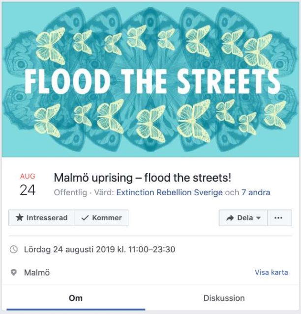 Nästa stora Extinction Rebellion-aktion är planerad till den 24 augusti 2019 i Malmö mot ”okänt mål”. Det beräknas bli den största hittills och går under namnet ”Malmö uprising – flood the streets”.