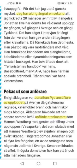 Enligt åklagaren var Pye anstiftare vid kravallerna och anförde stenkastare, bland annat Hannes Westberg som sedermera blev skjuten i magen. I intervjun säger han även att han inte ångrat en enda sekund att han fick sitta i fängelse.