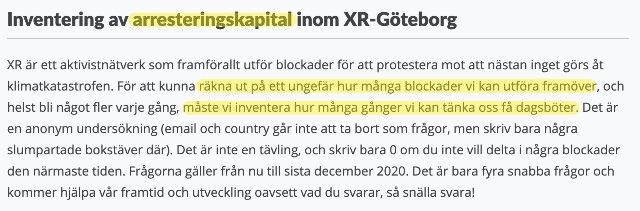 Men nu börjar pengarna tryta. Nyligen startade Extinction Rebellion därför en kampanj där man låter medlemmar fylla i hur ofta de är beredda att begå brott för deras sak. Syftet med undersökningen var att lägga upp en ekonomisk strategi.