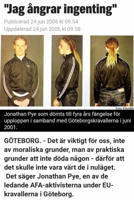 Pye räknas även som en av nyckelpersonerna bakom Göteborgskravallerna för ett antal år sedan och dömdes för dessa till 4 års fängelse för stenkastning mot polis, varav han avtjänade 1,8 år.