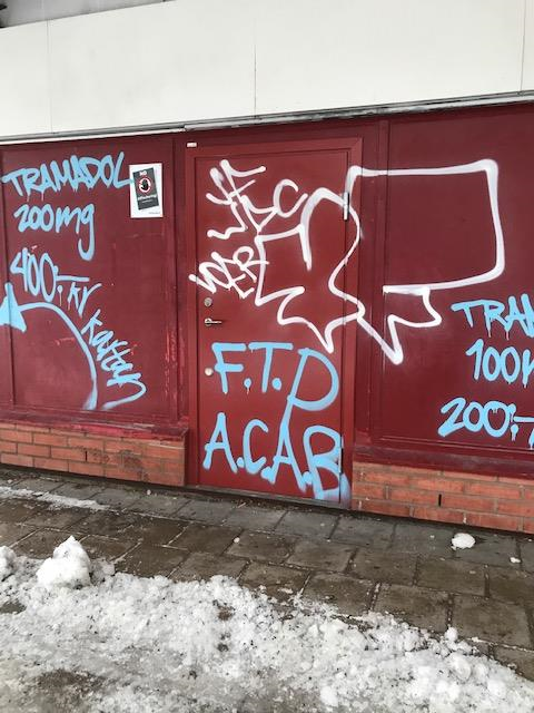 Vidare går det att läsa sådant som F.T.P. (Fuck The Police) och A.C.A.B. (All Cops Are Bastards). Nu blir ICA-handlaren själv tvungen att sanera sin fasad. Han är ”förbannad” men oroar sig samtidigt för barnen. Det är nämligen minderåriga personer som säljer knark utanför hans livsmedelsbutik.