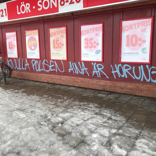 Det var i slutet av förra veckan som ICA-handlaren Patrik Vatka anlände till sin arbetsplats och upptäckte skadegörelse på fastigheten. På fasaden till ICA-butiken har man sprejat priser för hasch, kokain och smärtstillande tabletter. Det går även att läsa hatiska budskap som ”knulla polisen, aina är horunge”, rapporterar Fri Köpenskap. ”Aina” är invandrarslang för ”polis”