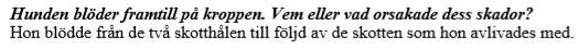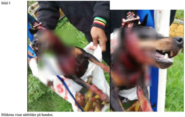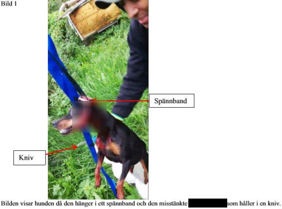 Hunden hänger med en strypsnara i form av ett spännband hårt åtdraget runt halsen. Vidare är den blodig runt den del av halsen man kan se. Dock är det svårt att avgöra var på halsen såren sitter. Färgen på tunga och ögon tyder på kraftig cirkulationssvikt eventuellt är hunden död.