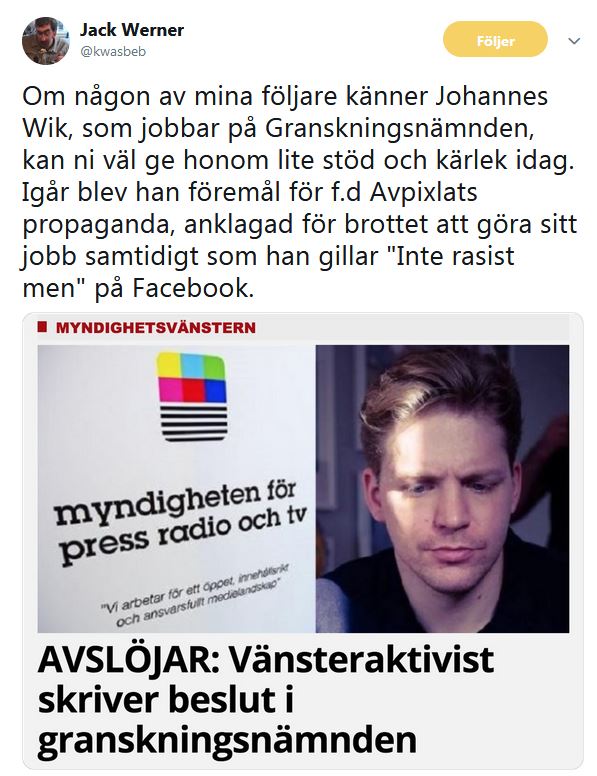 I tisdags kunde Samhällsnytt avslöja att en vänsteraktivist skriver beslut åt Granskningsnämnden som utövar tillsyn över public service. Vi kunde bland annat visa att under 2016 förberedde mannen procentuellt sett 50% färre fällande beslut än hans kollegor. Under 2017 fällde han public service för bristande opartiskhet endast en gång – för att SVT inte var tillräckligt vänstervridna och lät journalisten Janne Josefsson försvara yttrandefriheten i en debatt. Totalt har han varit delaktig i över 730 granskningsbeslut sedan 2013.