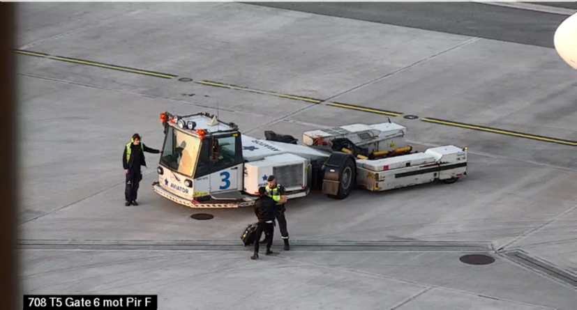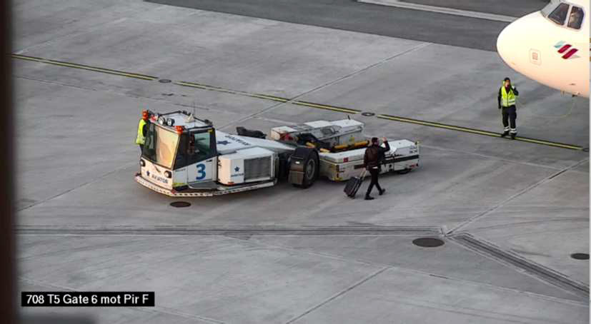 Det är piloterna i flygplanet som först ser mannen komma springandes mot planet. De larmar markpersonalen som arbetar med att taxa ut flygplanet från terminalen. Markpersonalen försöker ingripa mot mannen. Samtidigt stänger piloterna av motorerna eftersom det finns risk att någon skadas av dem.