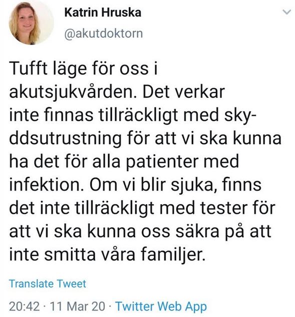 I princip omedelbart stoppades testerna. Numera kan endast personer som redan ligger på sjukhus testas för coronaviruset i Stockholm. En av anledningarna uppges vara bristen på testkit. Enligt nedanstående vittnesmål från en akutläkare är det både brist på sådana och på skyddsutrustning – till och med för sjukvårdspersonalen: