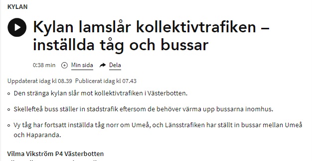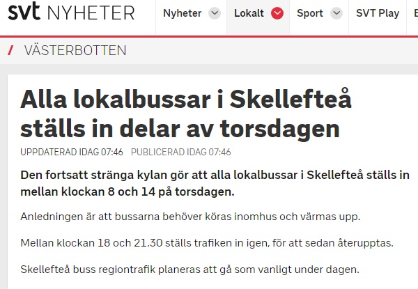 Skellefteå buss meddelar på sin hemsida att den stränga kylan medför ”en del störningar i kollektivtrafiken”.