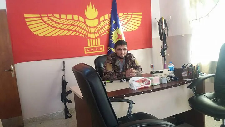 Nu pekas Salwan Momika ut som en före detta ledande officer i Folkets mobiliseringsstyrkor. I en artikel som publiceras på den amerikanska nyhetsplattformen Medium 2018 syns han sittandes iförd kamouflagekläder med en syriansk-arameisk flagga på väggen bakom sig, ett automatvapen lutat mot väggen och en pistol på ett skrivbord framför sig.