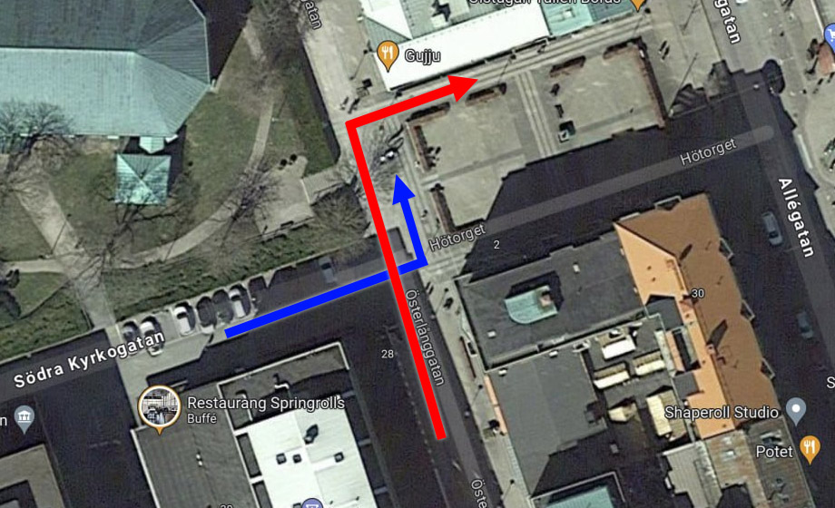 När demonstranterna tågar längs Österlånggatan, en gågata där bilar inte får köra, kommer plötsligt en röd Saab körandes.