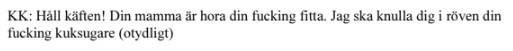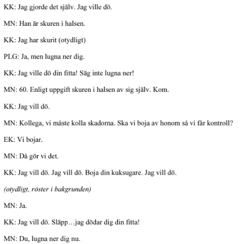 De ingripande poliserna bar kroppskameror som fångade en konversation mellan Kourosh (KK) och poliserna. Det framgår att han inte accepterat att lyda polismans order utan svarat med att skrika ”säg inte lugna ner”, ”boja mig din kuksugare” och mordhotat poliserna, ”jag dödar dig din fitta”.