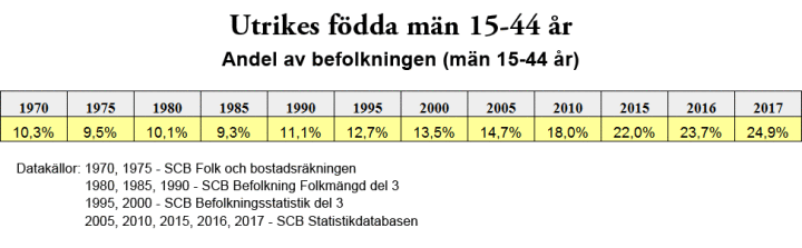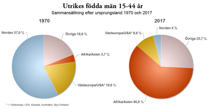 1970 var närmare 60 procent av invandrade män i Sverige födda i något av de övriga nordiska länderna. Idag är den siffran nere i 4 procent. Idag är det i stället män från Afrika och Asien (framför allt den västra delen av kontinenten) som utgör nästan 60 procent av de invandrade männen. En fullständig invertering alltså.