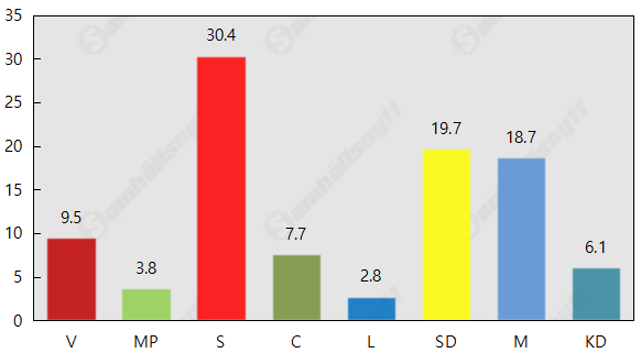 Ett sviktande stöd har även drabbat Liberalerna som nu ligger långt under riksdagsspärren med 2,8 procents stöd. Inte heller Miljöpartiet klarar i denna mätning spärren.