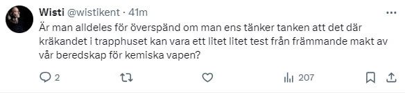 En av de mer fantasifulla hypoteserna är att det är Ryssland som ”testar” kemiska vapen på den svenska befolkningen. En hypotes som bland annat förs fram av den vänsterprofilerade och mediekände prästen Kent Wisti.
