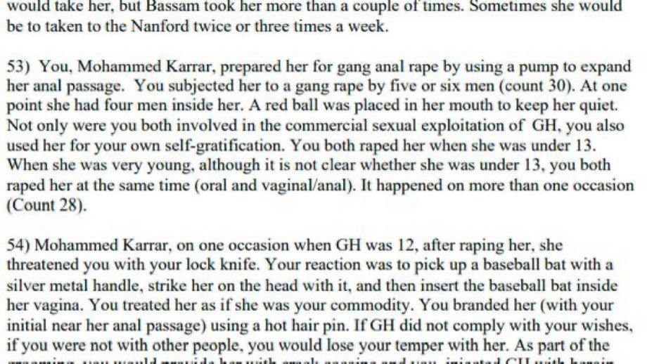 Du, Mohammed Karrar, förberedde henne för en anal gruppvåldtäkt genom att använda en pump för att utvidga hennes anala passage. Du utsatte henne för en gruppvåldtäkt av fem eller sex män (åtalspunkt 30). Vid ett tillfälle hade hon fyra män i sig. En röd boll placerades i hennes mun för att få henne att hålla tyst. Ni var inte bara båda inblandade i den kommersiella sexuella exploateringen av GH, ni använde henne också för er egen självtillfredsställelse. Ni våldtog henne båda två när hon var under 13 år. När hon var mycket ung, även om det är oklart om hon var under 13 år, våldtog ni henne båda samtidigt (oralt och vaginalt/analt). Det skedde vid mer än ett tillfälle (åtalspunkt 28). Mohammed Karrar, vid ett tillfälle när GH var 12 år, efter att ha våldtagit henne, hotade hon dig med din låskniv. Din reaktion var att ta upp ett basebollträ med ett silverfärgat metallhandtag, slå henne i huvudet med det och sedan föra in basebollträet i hennes vagina. Du behandlade henne som om hon var din handelsvara. Du brännmärkte henne (med din initial nära hennes analgång) med hjälp av en het hårnål. Om GH inte gjorde som du ville, om du inte var med andra människor, tappade du humöret på henne