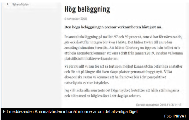 I tisdags gick Kriminalvården ut med information internt till personalen om hur den höga beläggningen pressar verksamheten hårt. I utskicket tackas de anställda som fortsätter kämpa i den ansträngda situationen.