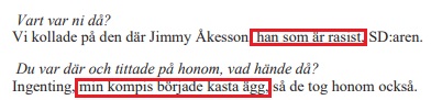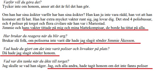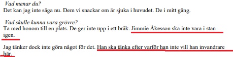 Kevin: ”Skulle slå sönder Åkesson” När polisen och Säpo förhör Kevin är han öppen med sitt hat mot Åkesson och SD. Han berättar bland annat att han och ”blattekompisarna” hade slagit sönder Åkesson om det inte funnits poliser på plats.