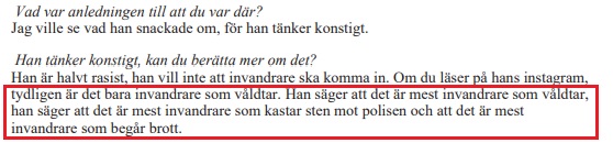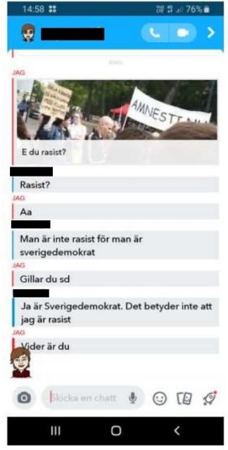 I sociala medier visar det sig existera underlag för påståendena. Nedan en skärmdump från en konversation mellan Kevin och en sverigedemokrat. Kevin frågar om personen är ”rasist”. Sedan går han vidare att med att kalla denne för ”vider”.