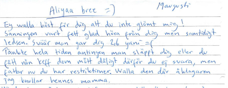 I augusti 2022, när han avtjänar ett fängelsestraff för grovt vapenbrott och nakotikabrott, skickar Bilal Kalpak ett brev till en yngre kvinna som samtidigt sitter häktad i Sollentuna för ett grovt brott.
