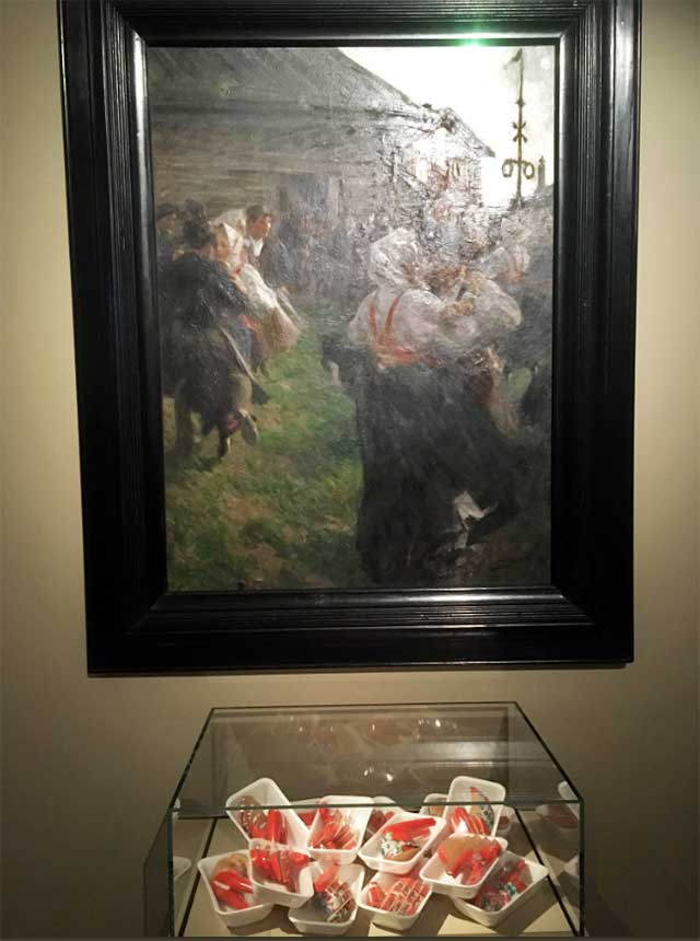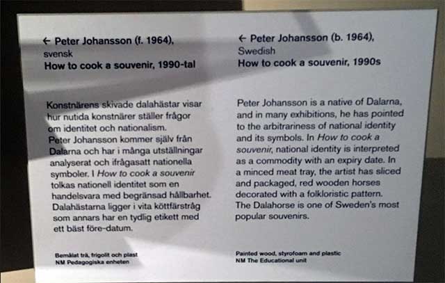Framför Anders Zorns målning ”Midsommardans” har exempelvis en plastmonter placerats i vilken kastats in ett antal köttfärsförpackningar men där innehållet i stället är strimlade dalahästar. Skapelsen som bär namnet ”How to cook souvenir” har förfärdigats av en Peter Johansson, för de flesta svenskar sannolikt helt okänd men i kulturkretsar uppmärksammad för bland annat en inlämnad ansökan till Falu kommun om att få riva Carl Larsson-gården i Sundborn.
