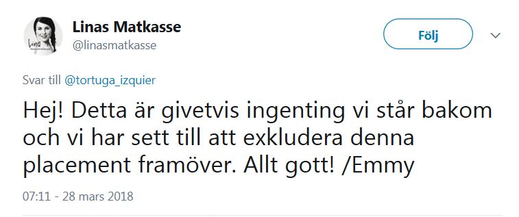 Uppdatering: kort efter att artikeln publicerats svarade Lina Matkasses kommunikationschef Stina Svensson på vårt mejl med förfrågan om kommentar om sitt agerande: