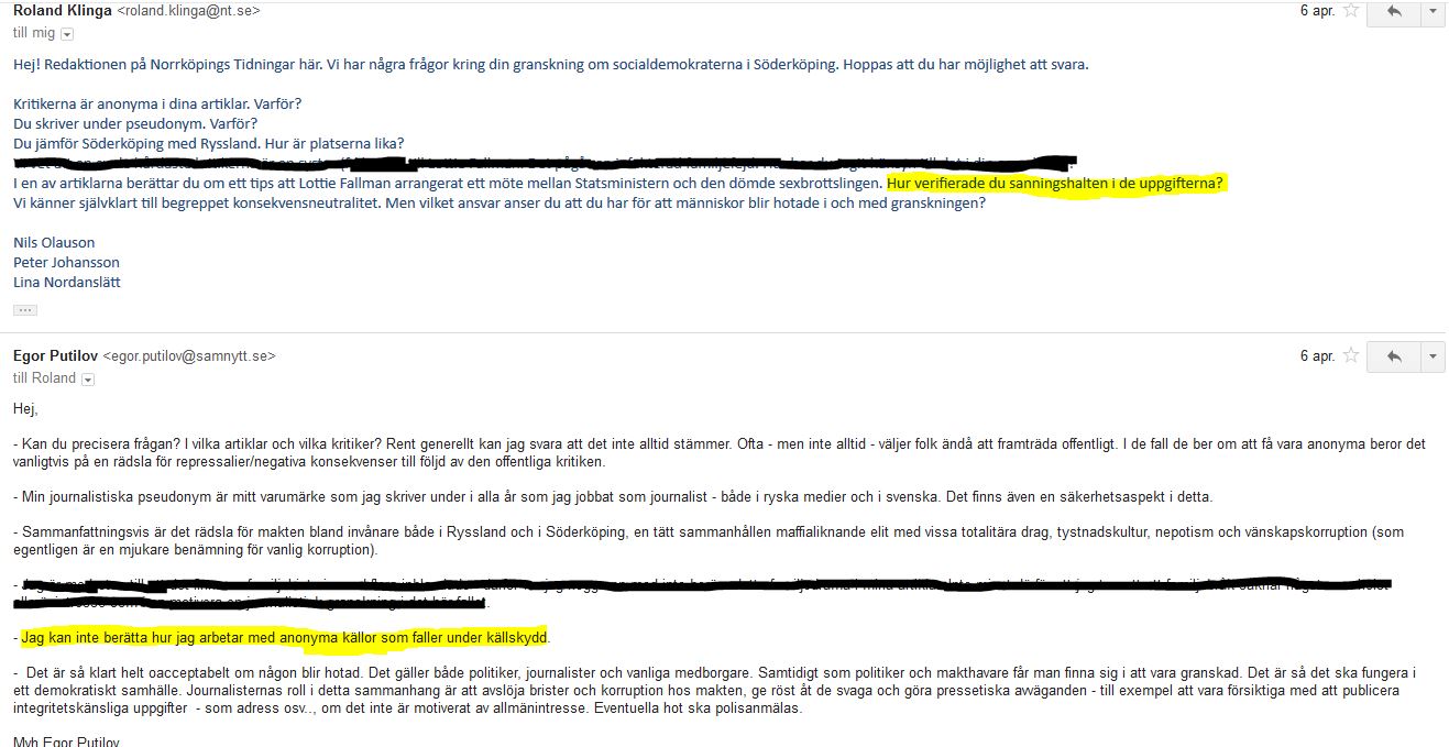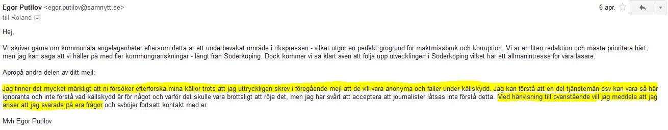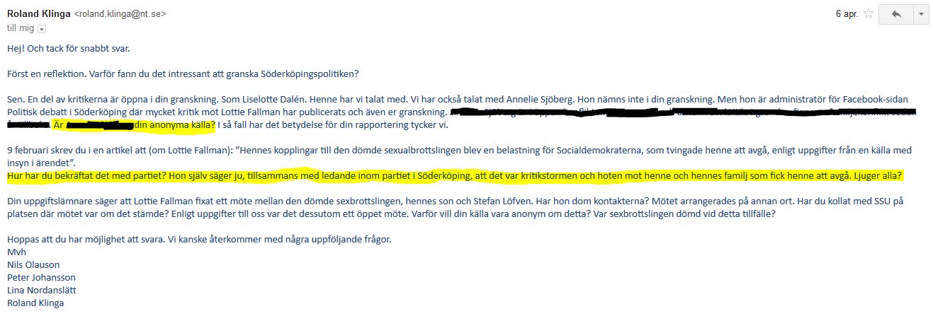 Men när Samhällsnytt kontrollerar påståendet visar det sig inte stämma. Robert Klinga gavs ett utförligt svar på sin fråga – inte bara en utan två gånger. Frågan som han ställde var djupt oetisk journalistiskt – Klinga ville veta vem källan var till uppgiften om att Fallman blev en belastning för socialdemokraterna i Söderköping vilket ska ha blivit orsaken till hennes avgång. Detta trots att det tydligt framgår i vår text att källan inte vill vara namngiven.  Förutom den journalistiska etiken har vi som publikation med utgivningsbevis en lagstadgad skyldighet att skydda våra källor – att bryta mot tystnadsplikt kan straffas med upp till ett års fängelse.