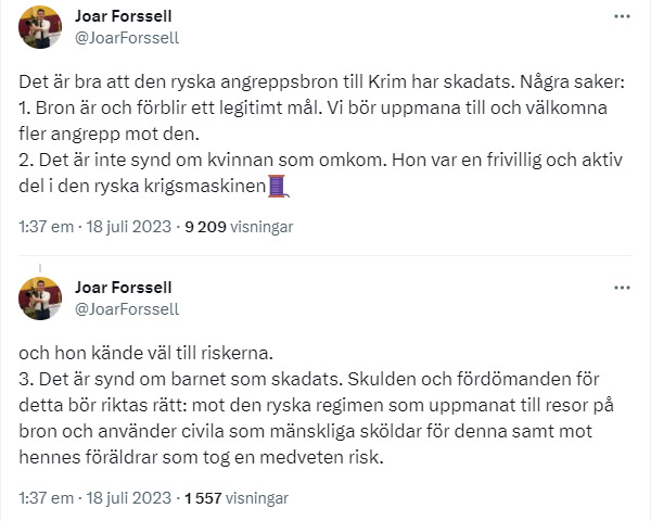 En av dem som stämmer in i det ukrainska hånet av de civila offren för attacken är Liberalernas riksdagsledamot och utrikespolitiske talesman Joar Forssell. I ett inlägg på Twitter påpekar han under tisdagen att bron är ett legitimt mål för Ukraina, och vill ”uppmana till och välkomna fler angrepp mot den”.