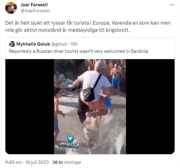 Joar Forssell sprider även en film som påstås visa hur en rysk turist på den italienska ön Sardinien blir nedsparkad på stranden. ”Det är helt sjukt att ryssar får turista i Europa”, skriver L-toppen.