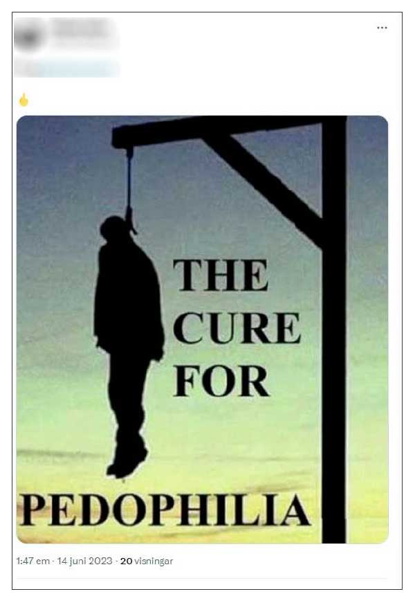 Det fick den nu dömde mannen att posta ett inlägg på X med en bild föreställande en hängd person och texten ”The cure for pedophilia”.