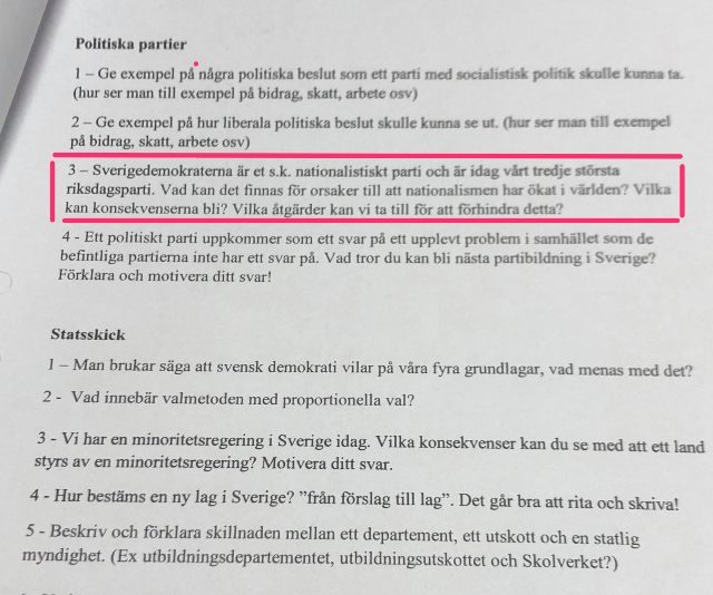Hej igen! Jag har pratat med rektor Jörgen Malm och visat uppgiften och vi är överens om att uppgiften inte är formulerad på ett opartiskt sätt. Jörgen kommer att prata lärarna i samhällskunskap på programmet. Med vänlig hälsning Ulla-Britt Persdotter