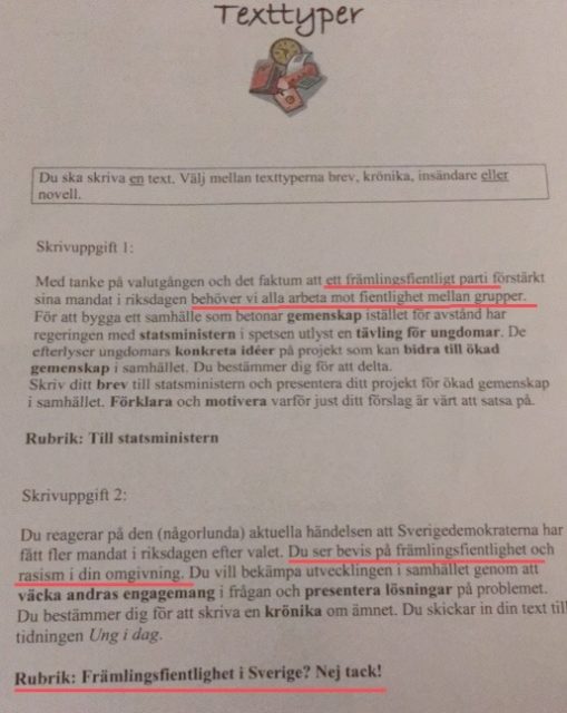Av den andra skrivuppgiften som innehar arbetsrubriken ”Främlingsfientlighet i Sverige? Nej tack!” framgår det att Sverigedemokraterna specifikt har fått fler mandat i riksdagen efter valet och eleverna ska sätta sig in i att de ”ser bevis på främlingsfientlighet och rasism” i deras omgivning. Eleverna ska därför bekämpa utvecklingen genom att väcka andras engagemang och presentera lösningar på problemet.