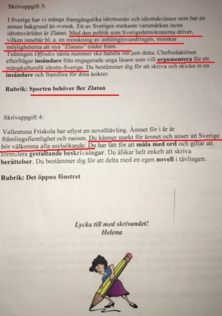 Det är svenskläraren vid Vallentuna Friskola som står bakom arbetsuppgiften vilken på onsdagen delades ut till elever i årskurs nio. På informationsbladen finns fyra skrivuppgifter som liknar SD vid något främlingsfientligt och rasistiskt. Vidare ska eleverna även propagera för ett mångkulturellt Sverige som välkomnar fler asylsökande.