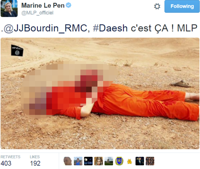 Det var i samband med terrorattackerna i Paris år 2015 som den konservativa politikern Marine Le Pen publicerade tre bilder som visade terroristorganisationen Islamiska statens brutala terrorhandlingar. I Frankrike är det olagligt att dela våldsamma bilder vilket resulterade i att en åklagare beslöt sig för att åtala partiledaren.