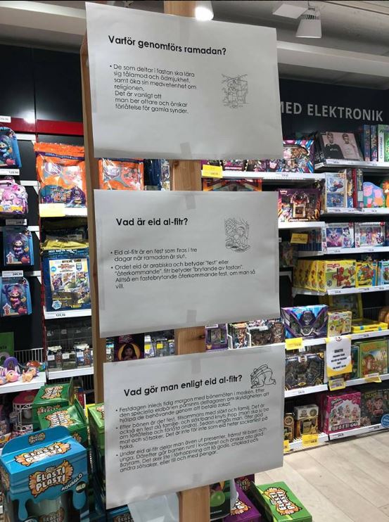 Det var i lördags som en Facebook-användare reagerade på att en leksaksbutik i Halmstad – nämligen BR Leksaker City – uppmärksammar den muslimska fastetiden Ramadan i en serie ovanliga informationsskyltar. Av den bild som hon har lagt ut i gruppen Stå upp för Sverige framgår bland annat att ”det är vanligt att man ber oftare och önskar förlåtelse för gamla synder.”