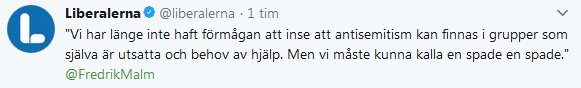 ”Många har länge inte haft förmågan att inse att antisemitism kan finnas i grupper som själva är utsatta och behov av hjälp. Men vi måste kunna kalla en spade en spade.” @FredrikMalm — Liberalerna (@liberalerna) 18 december 2017