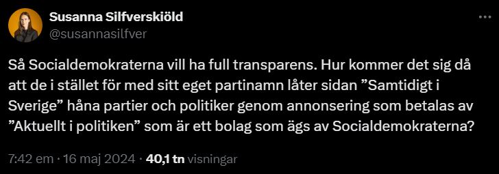 Men varför frågar de inte Socialdemokraterna om deras anonyma konton? (Har någon journalist gjort det under den senaste veckans händelser?) Sannolikt för att de sysslar inte med journalistik, de är smygaktivister för de rödgröna. https://t.co/KfJ5ur2v9t pic.twitter.com/rvXBA6uM9V— Michael Levandi ✡️ (@mikelevandi) May 17, 2024