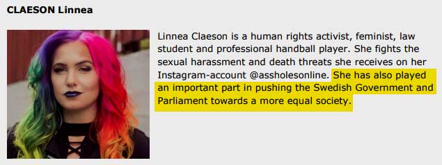 Hon hävdade i en skriftlig sammanställning inför eventet, där talarna fick beskriva sig själva, att hon haft en avgörande inverkan på den svenska regeringens och riksdagens jämställdhetspolitik.