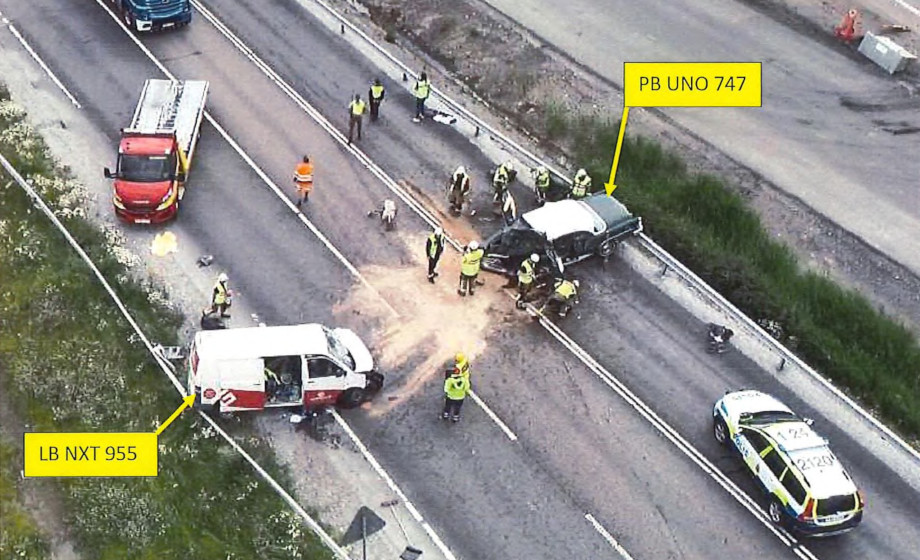 I motsatt riktning, på E18 ett par mil väster om Västerås, kommer plötsligt en vit skåpbil över på fel sida av vägen. Den försöker köra om ett antal lastbilar.