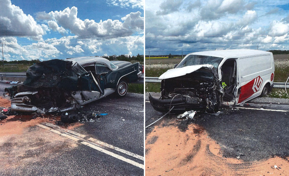 Den 42-årige mannen i buicken trampar allt han kan på bromsen, men det hjälper inte. Det blir en våldsam smäll mellan de båda fordonen, med bildelar som flyger genom luften och regnar ned på övriga bilar.